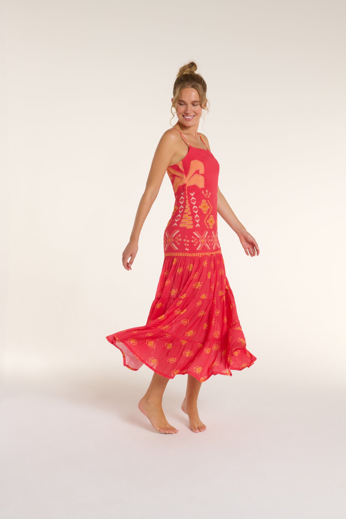 This tiered maxi silhouette is crafted from a breezy, lightweight fabric that moves beautifully from beach to dinner. Featuring our Colombian-inspired print in warm pink and golden tones, the Poppy blends statement-making style with all-day comfort. Delicate adjustable straps and a softly draped bodice lend a barely-there feel, while the voluminous skirt brings a romantic, flowy finish. Whether layered over swim or styled solo, the Poppy is your go-to for bold, relaxed resort dressing with a touch of heritage charm.