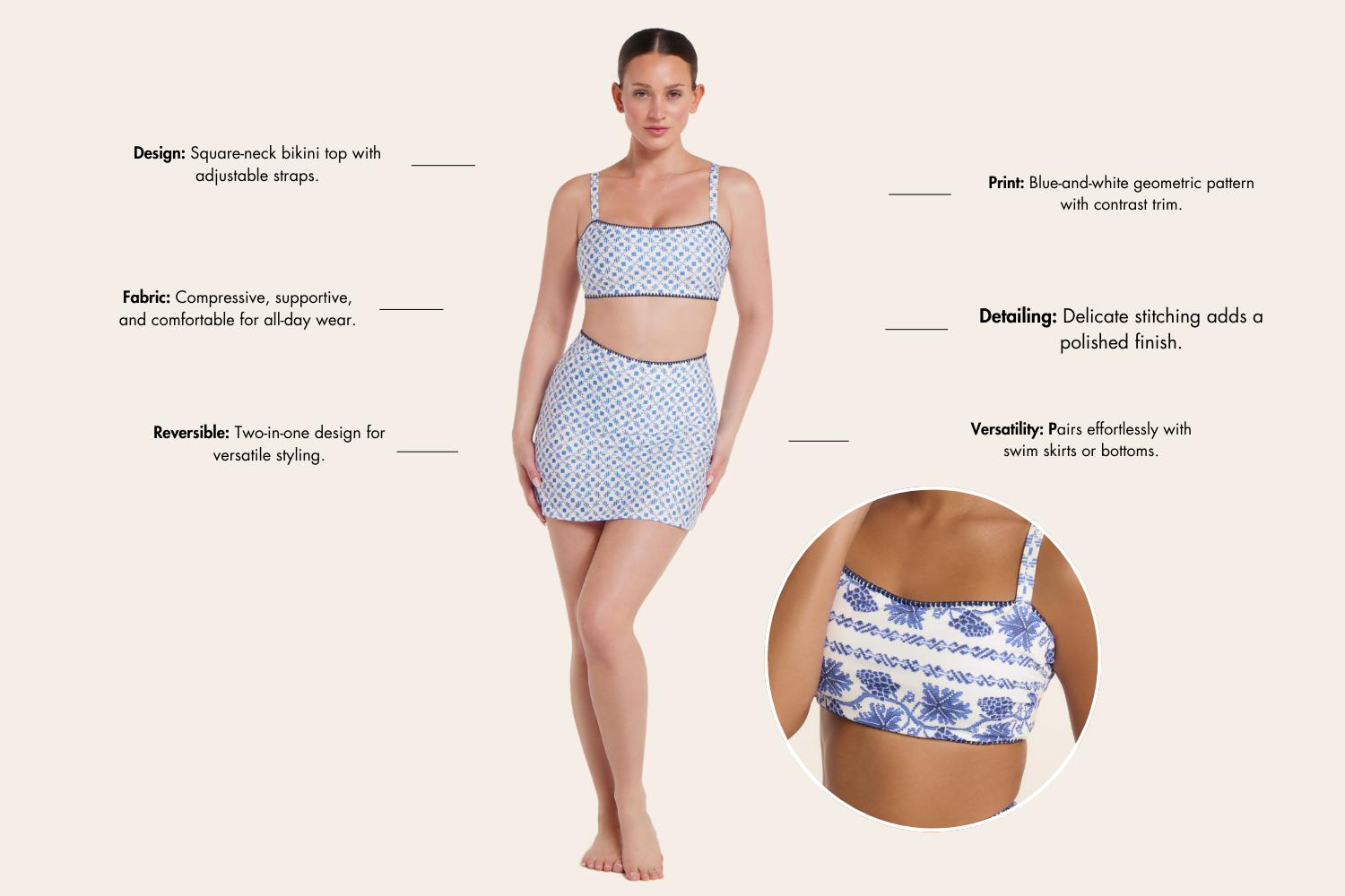 • Design: Square-neck bikini top with adjustable straps.