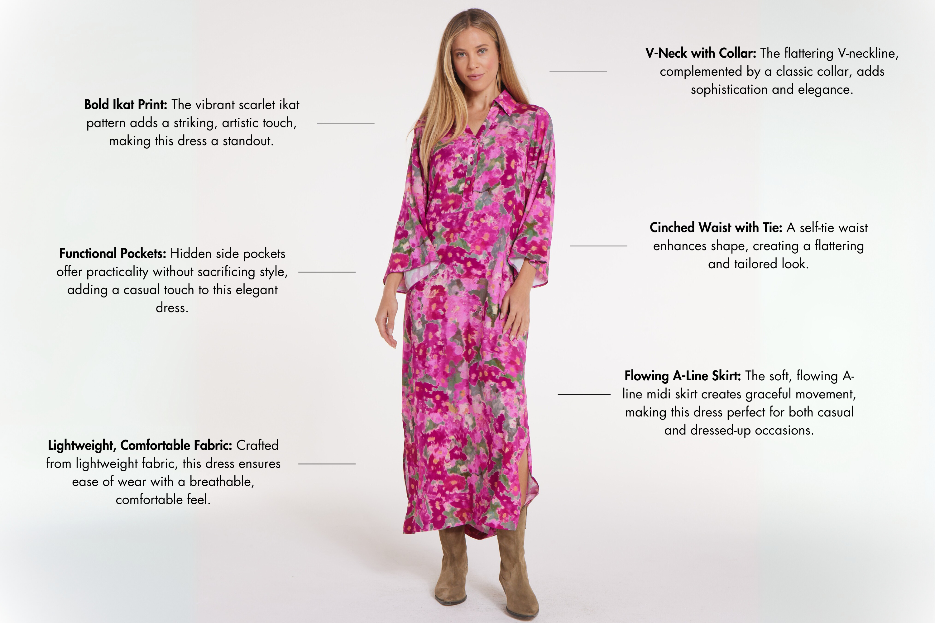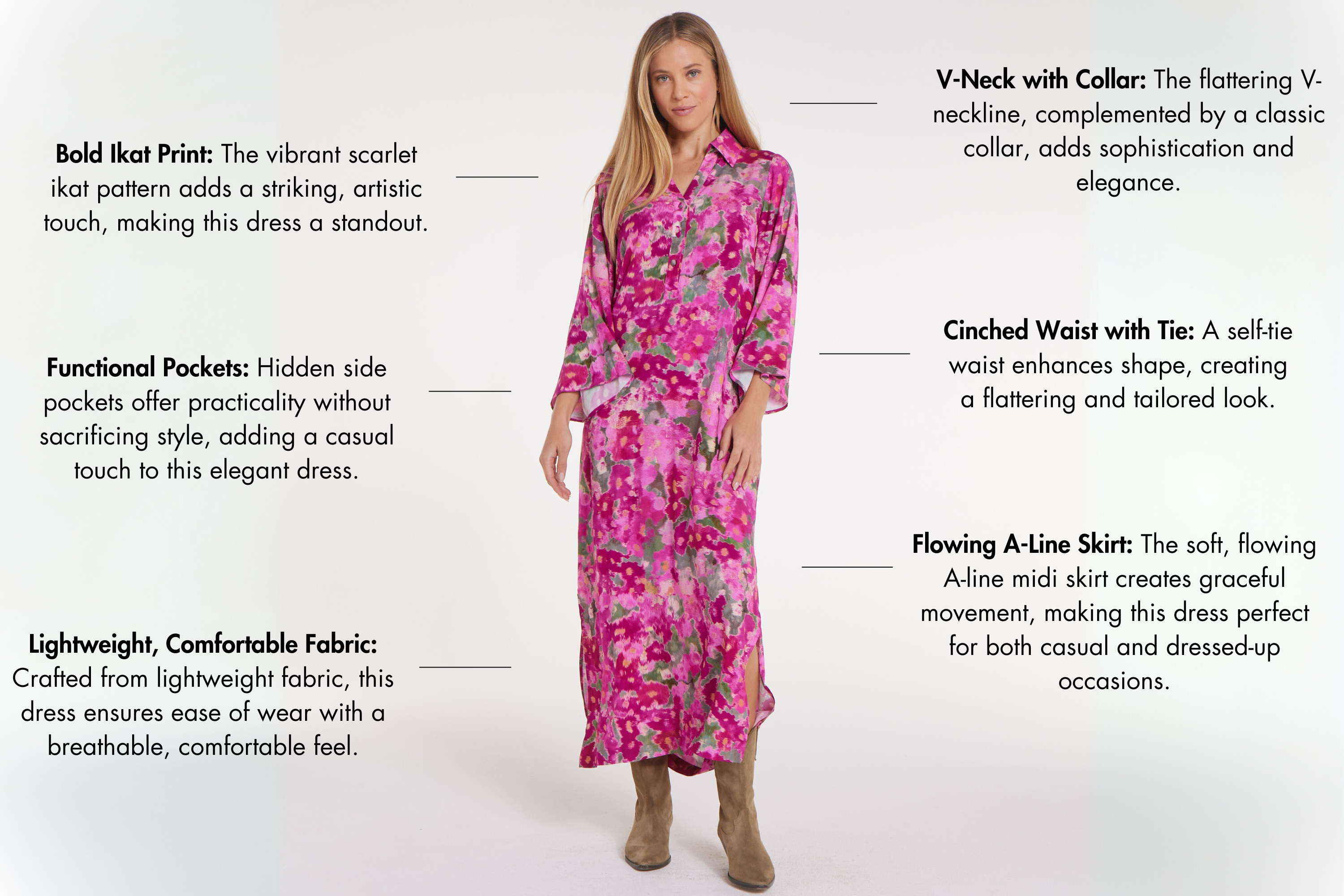 Perfect for Any Occasion, Meet the Antoinette Midi Dress in Bold Scarlet & Pink Ikat Print