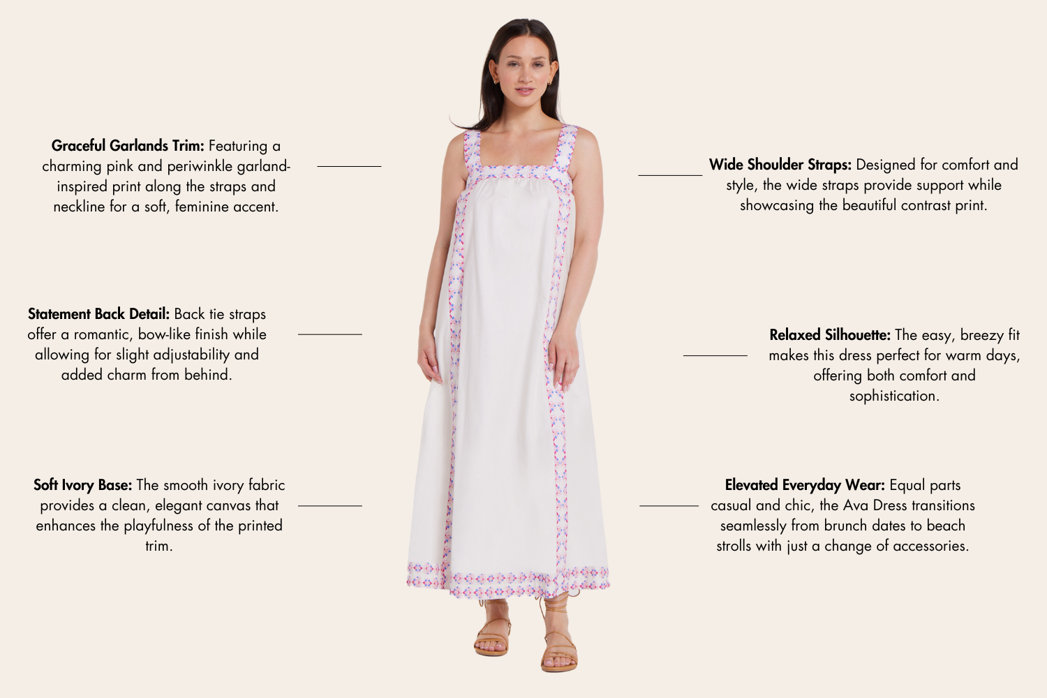 The Ava Dress brings a sense of lightness and charm to every step. Its easy silhouette is complemented by wide straps and delicate trim in our Graceful Garlands print—creating a look that feels both playful and polished. The subtle ivory base offers an elegant contrast, while the back-tie detail adds a thoughtful, feminine finish. Whether styled casually or dressed up for a special moment, the Ava Dress is a fresh take on effortless femininity.