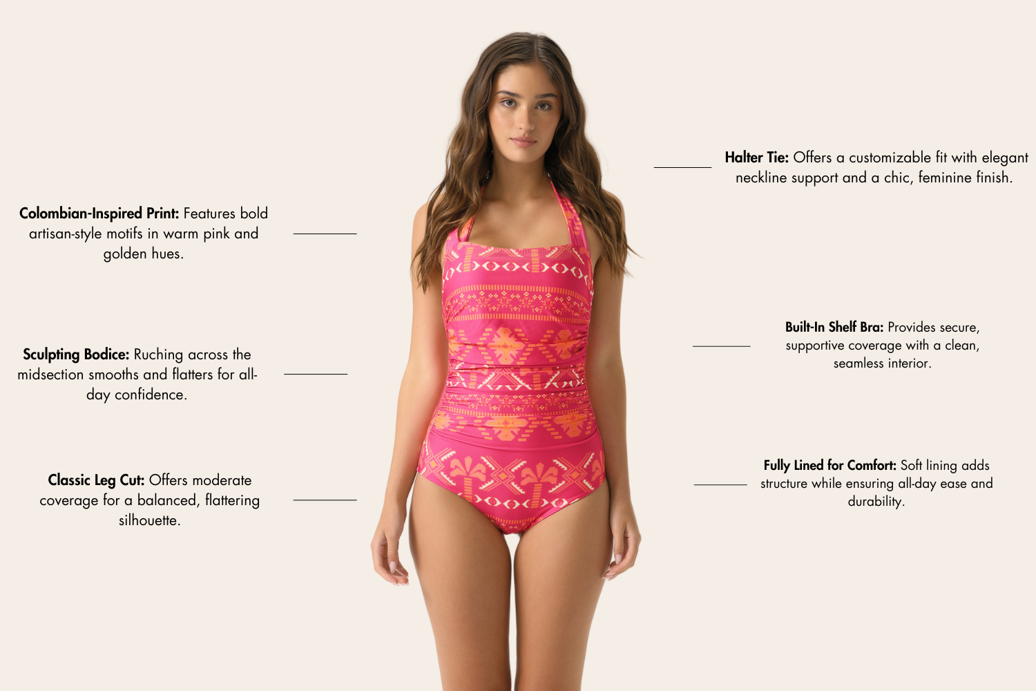 Designed in our Colombian-inspired ethnic print, this halter-tie silhouette flatters with soft ruching through the waist and a clean, supportive neckline. The rich pink and golden palette adds bold sophistication, while the classic leg cut and built-in shelf bra ensure all-day comfort and ease. Whether you're poolside with a sarong or stepping into the surf, the Marilyn offers timeless coverage with a confident, culture-rich twist.
