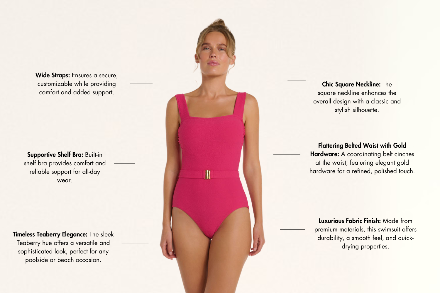 Stand out in color and confidence. The Marisa’s structured square neckline, waist-accentuating belt, and vibrant teaberry hue offer the perfect balance of support and sophistication. Whether you’re soaking up the sun or styling it with your favorite trousers, the Marisa in Teaberry is made to move with you—from beach days to summer nights.