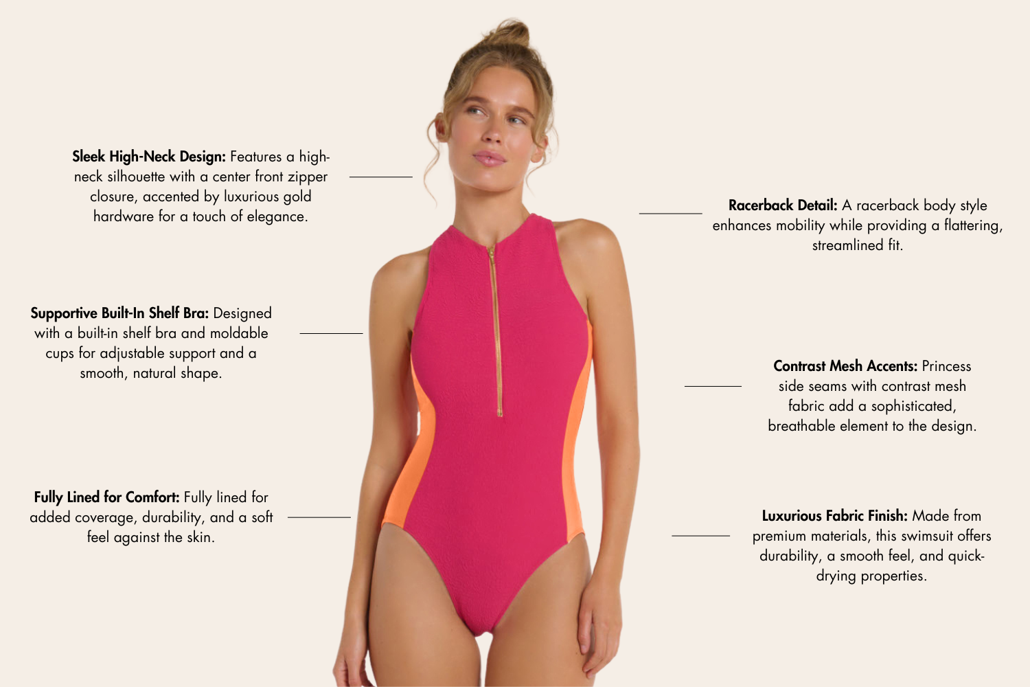 This standout suit blends sporty edge with feminine refinement, featuring a high neckline, racerback silhouette, and an adjustable front zipper for customizable coverage. The contrasting papaya side panels create a contouring effect, visually sculpting the waist for a flattering fit. Crafted from compressive, fully lined fabric, the Margaret offers full coverage and all-day support—making it a statement piece that’s as functional as it is striking.