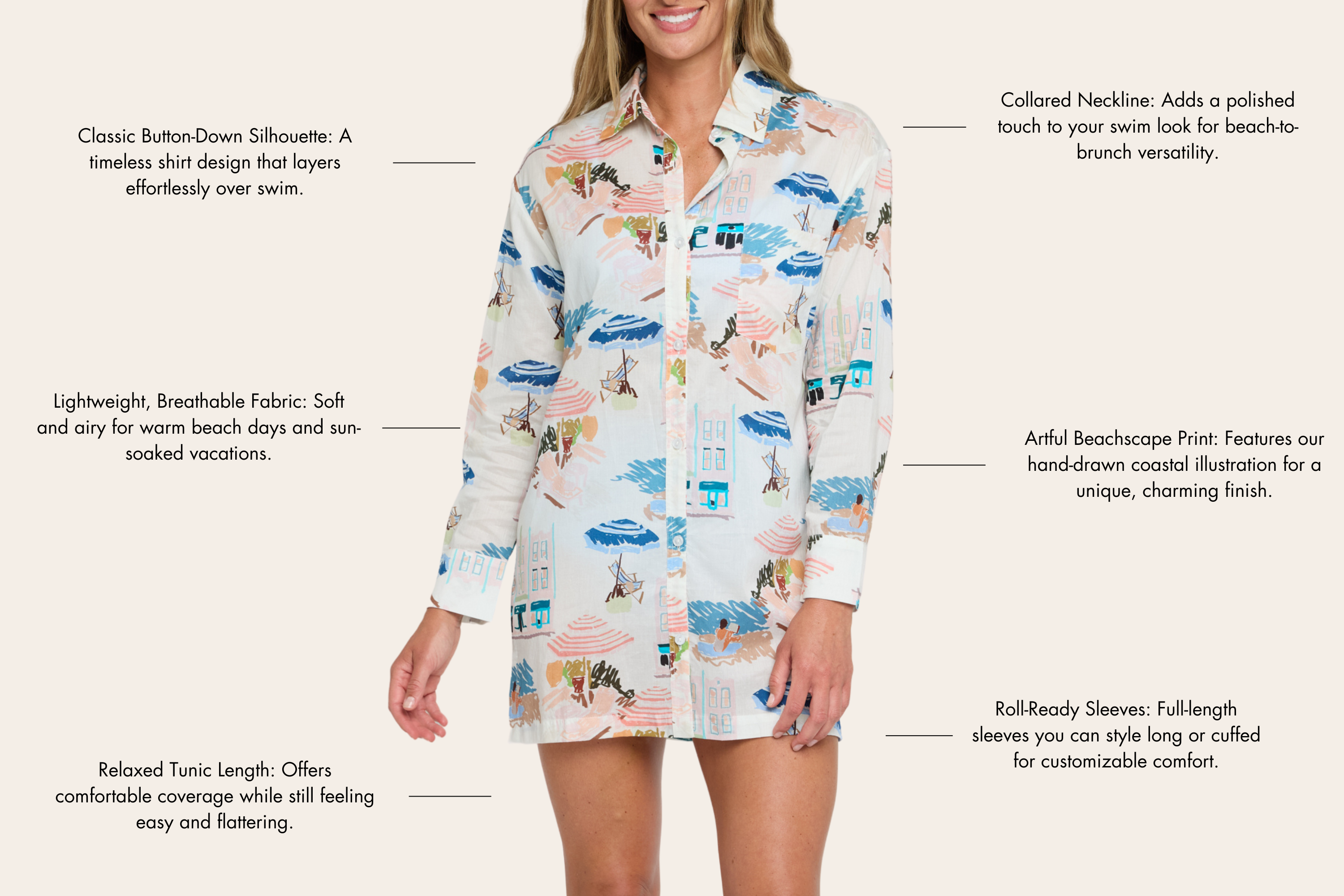 Effortlessly chic and endlessly versatile, the Marie Shirt Dress brings coastal vibes to your everyday rotation. This collared button-front design transitions seamlessly from beach cover-up to casual dress, making it the perfect piece for warm-weather adventures. The relaxed silhouette flatters every figure while the breezy Coast to Coast print keeps things fresh and fun. Throw it on over a swimsuit, pair it with sneakers, or dress it up for sunset strolls—this wardrobe MVP does it all.
