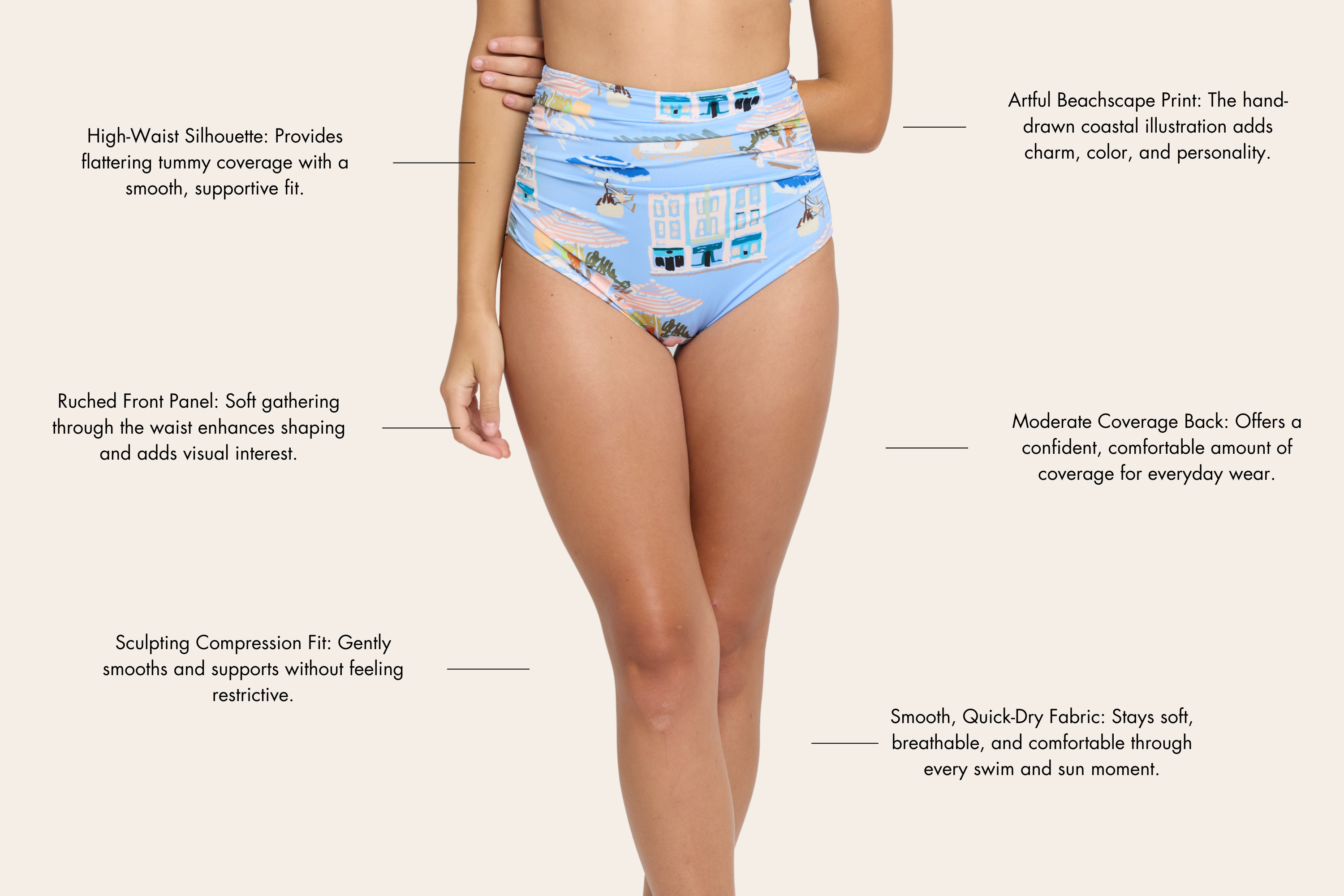 The Tod High Waist in Coast to Coast is your new secret weapon for feeling confident and fabulous. Designed with strategic ruching that smooths and flatters your midsection, this bottom delivers the tummy control you want without sacrificing style. The high-waist cut elongates your silhouette while hugging you in all the right places. Whether you're heading out for the day or getting ready for a night out, slip into these and feel the difference. Comfort meets confidence in every wear.