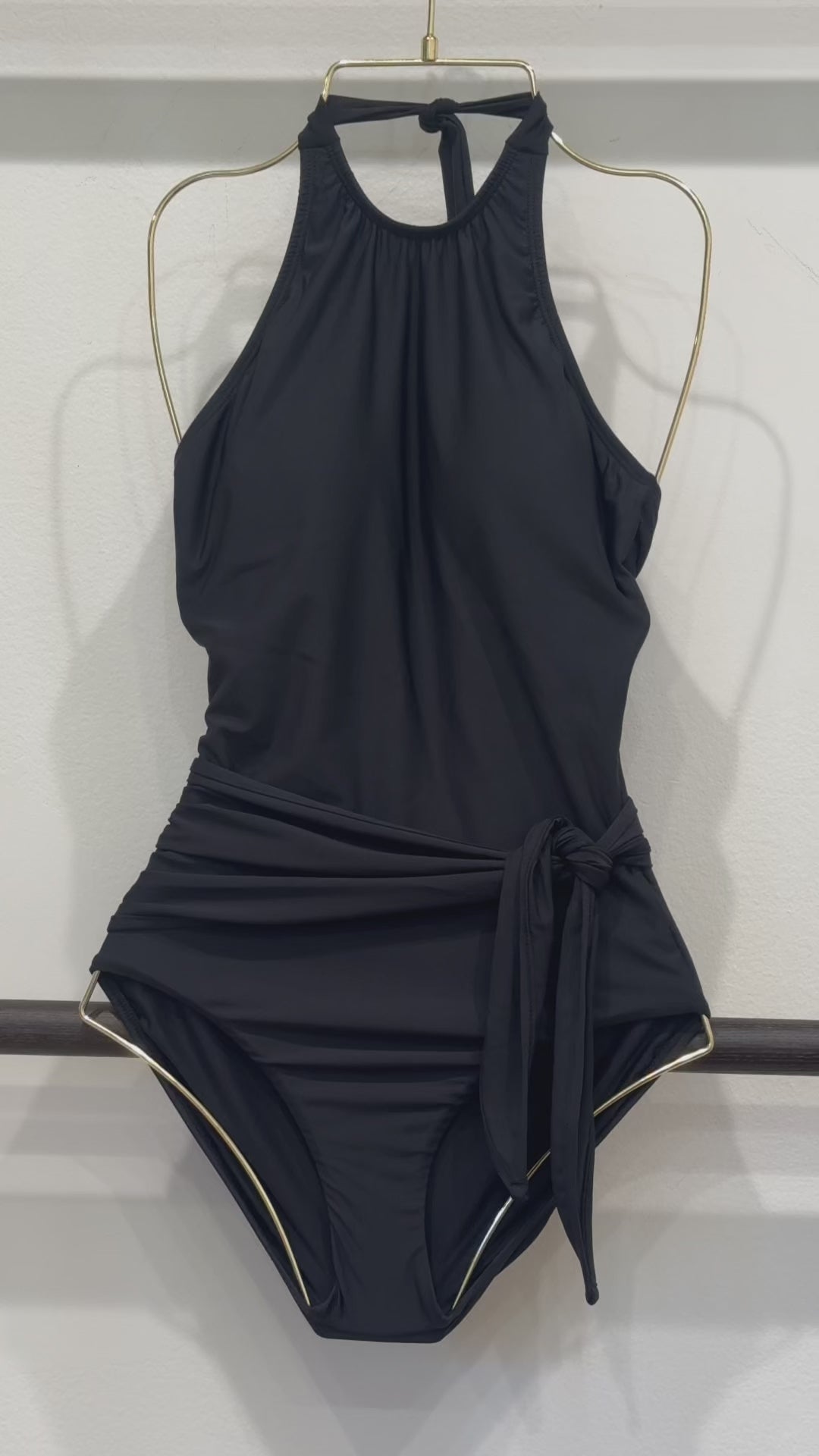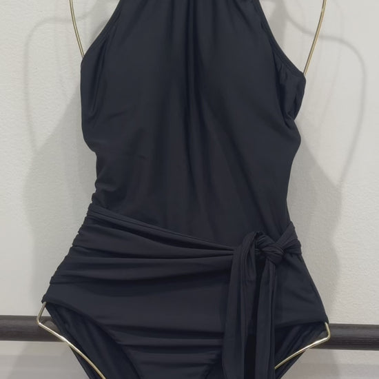 Genevieve High Halter Neck Sash Tie One-Piece Swimsuit in Black