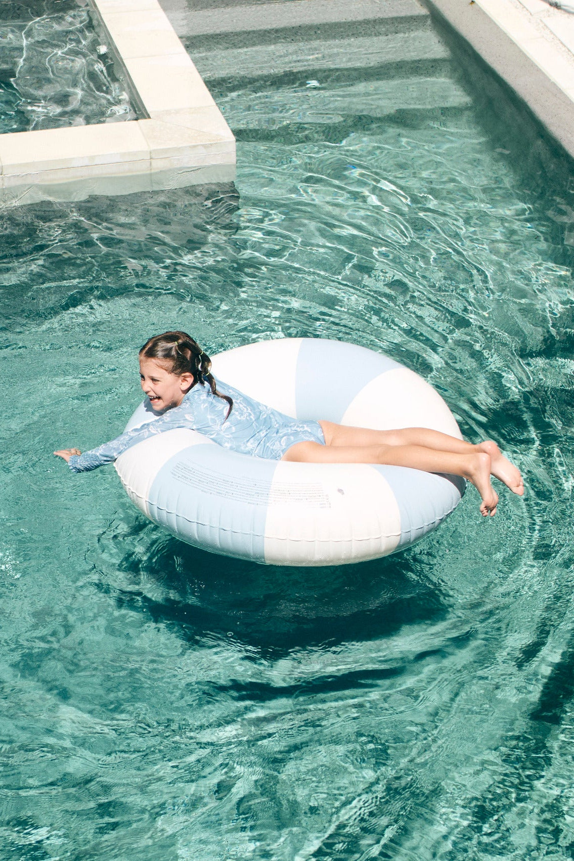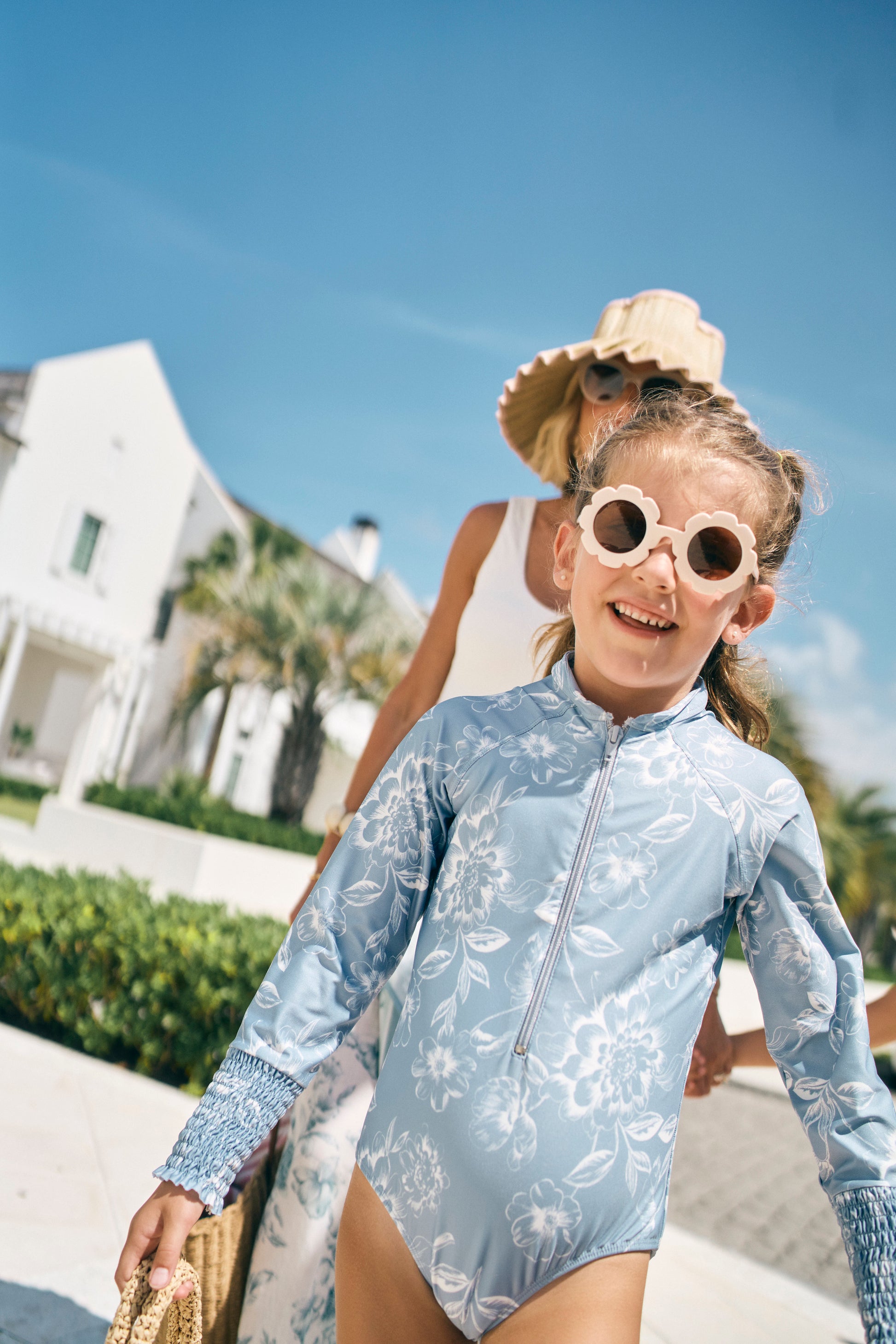 Designed with long sleeves, smocked cuffs, and a ruffled collar, this suit offers extra sun coverage while keeping things stylish and playful. The adjustable front zipper makes for easy on-and-off changes, while the soft floral print in powdery blue brings a timeless, gentle elegance. Fully lined and made to move with her, the Little Gayle combines thoughtful design with all-day comfort—perfect for pool play, beach days, and matching mommy-and-me moments.