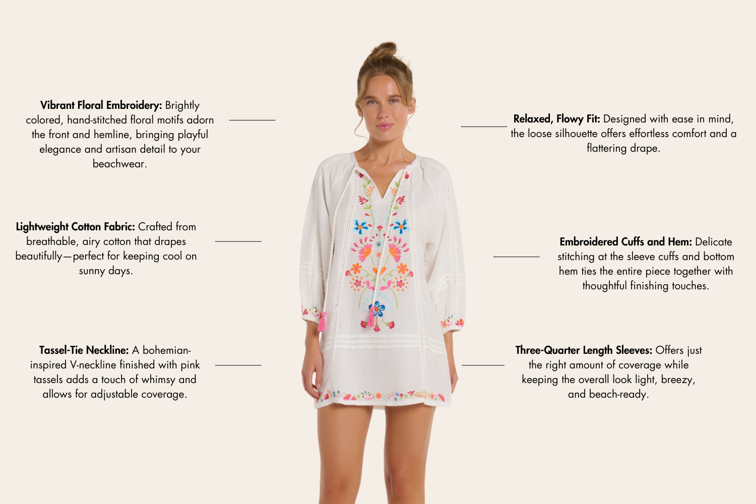 Adorned with vibrant floral embroidery and finished with a tassel-tie neckline, this cover-up is equal parts playful and polished. The relaxed silhouette and breezy three-quarter sleeves make it the perfect post-swim layer or casual vacation staple. A cheerful essential for the woman who loves a touch of whimsy in her warm-weather wardrobe.