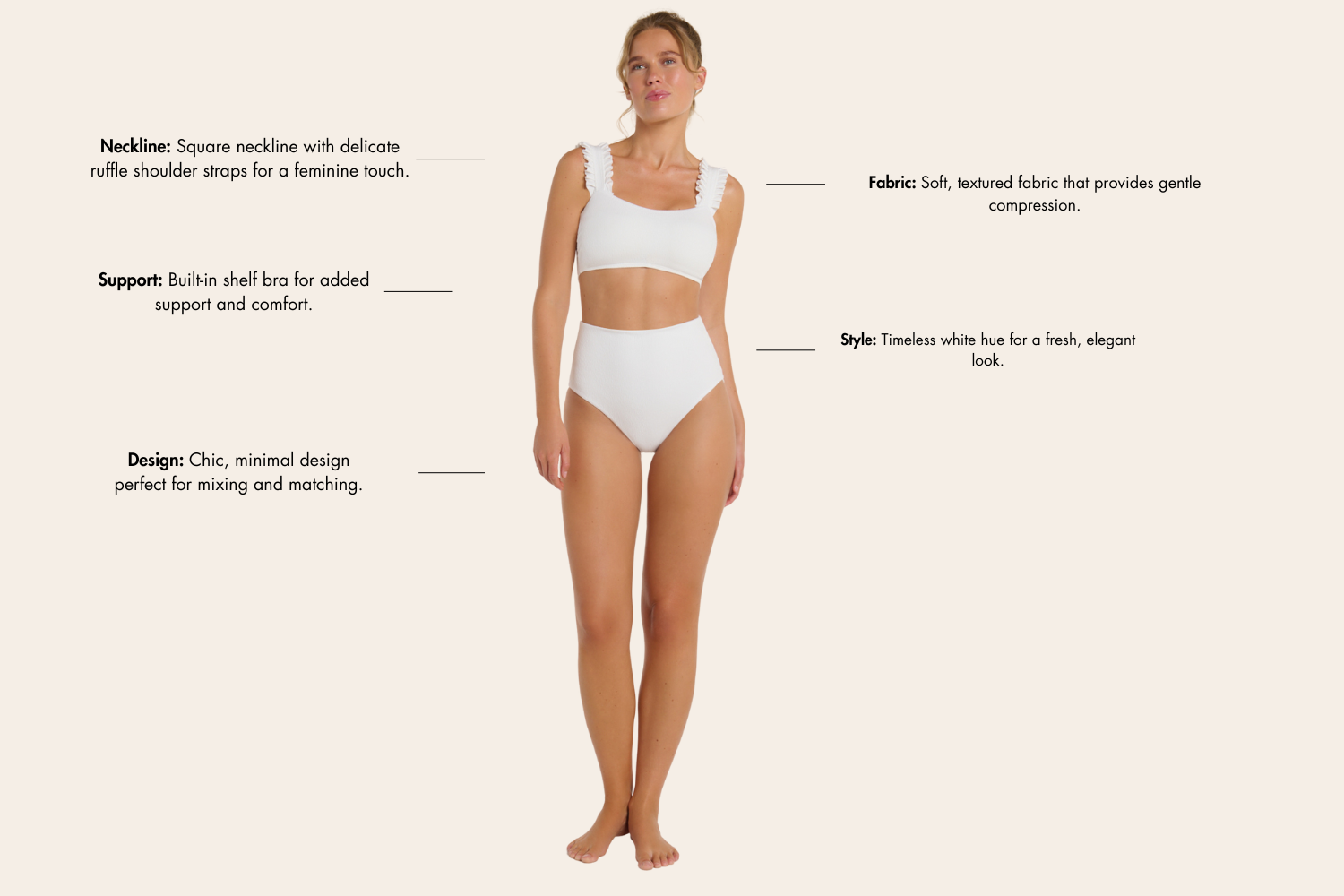This timeless swim top features a classic square neckline and delicate gathered detailing along the bust, offering both support and shape. The soft white hue adds a fresh, sophisticated touch, while the high-quality fabric ensures a smooth, comfortable fit. Perfect for pairing with your favorite swim bottoms or layering under a light cover-up, the Ruth Top is a must-have for those who appreciate simple, refined style.