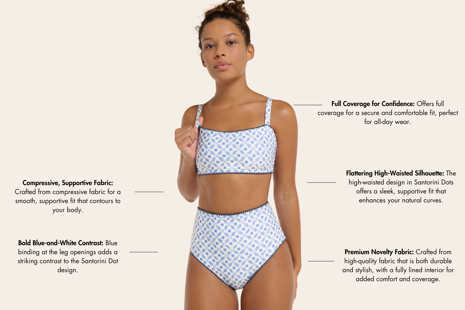 Elevate your swim style with our Mackenzie Bottoms in Santorini Dots. These sculpted high-waisted bottoms offer full coverage, ensuring both comfort and confidence in every wear. The playful dot print adds a touch of sophistication, while the high waist creates a flattering, smooth silhouette. Perfect for those who seek style and comfort, the Mackenzie Bottoms are a must-have addition to your swimwear collection for a chic and sophisticated look.
