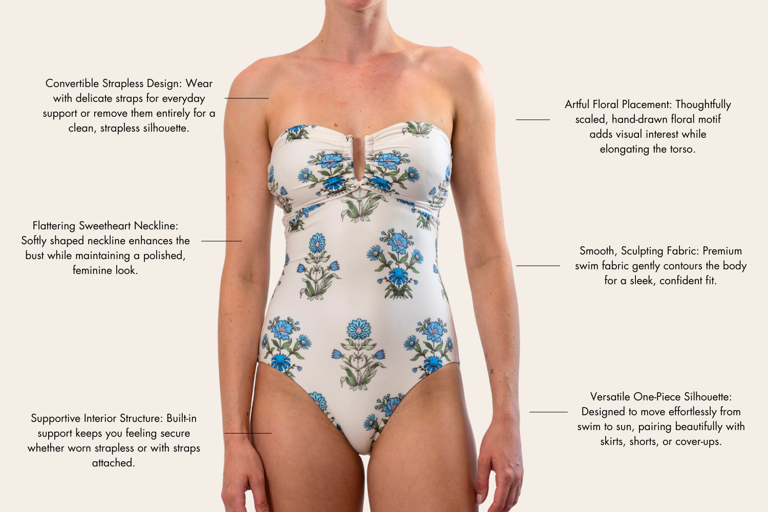 Designed with a flattering bandeau neckline and a soft floral print, this one-piece sculpts and smooths while still feeling effortless to wear. The removable straps give you styling versatility—strapless for sunbathing or added support when you want it—while the structured bodice creates a secure, flattering fit. Finished with classic coverage and a polished silhouette, Maribelle is the kind of suit you’ll pack for every warm-weather escape.