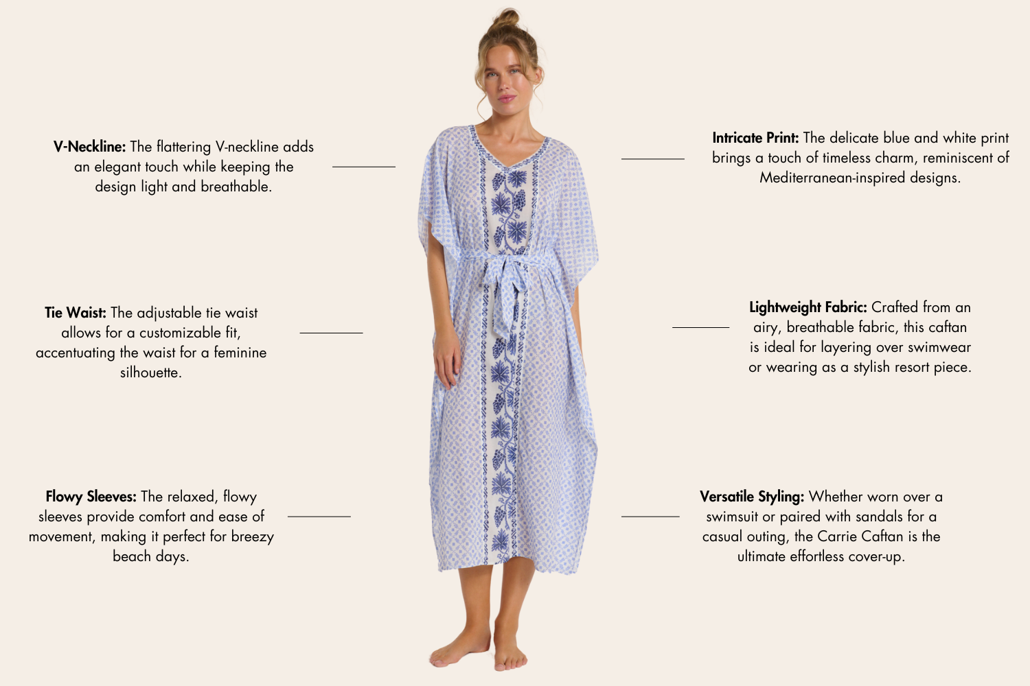 • Versatile Styling: Whether worn over a swimsuit or paired with sandals for a casual outing, the Carrie Caftan is the ultimate effortless cover-up.