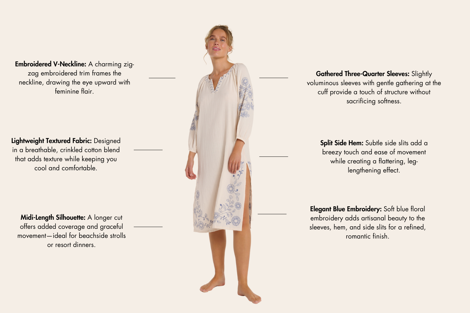 This midi-length silhouette features delicate floral embroidery in soft blue hues, adding a refined touch to its relaxed, flowy fit. The gathered three-quarter sleeves and embroidered V-neckline offer just the right amount of structure, while subtle side slits bring breezy movement and all-day comfort. Effortlessly chic and endlessly versatile, the Lydia is your go-to for elevated resort wear—whether you're heading poolside or out for a sunset dinner.