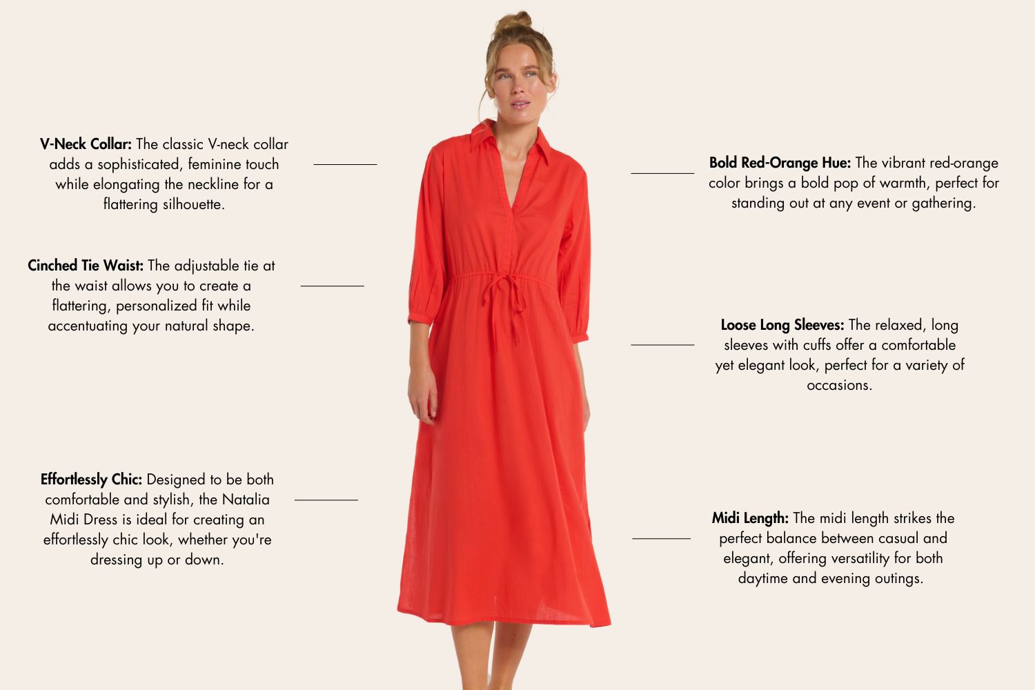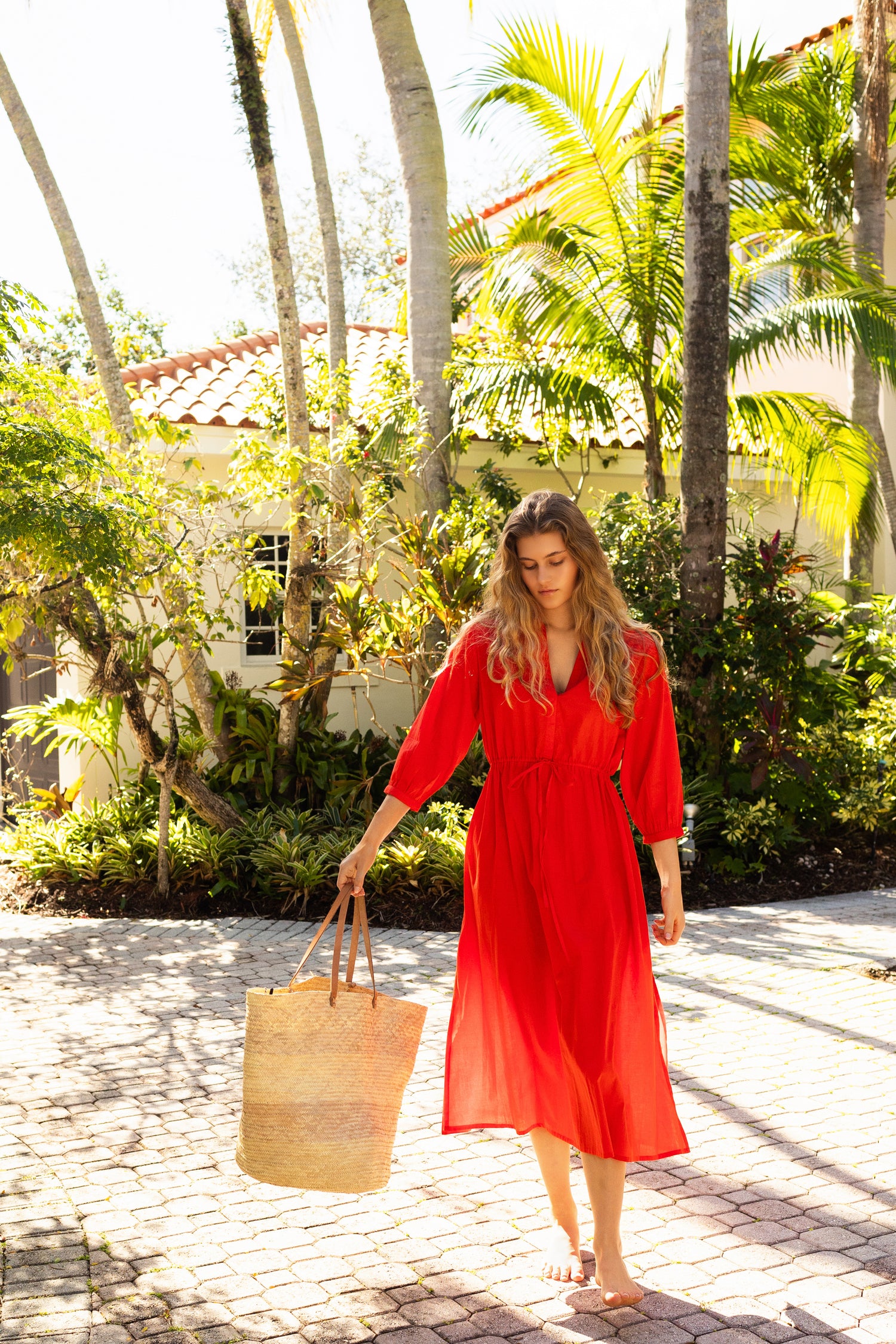 Chic, vibrant, and undeniably stylish, the Natalia Cover-Up in red-orange is designed to elevate your warm-weather wardrobe. Crafted from breathable linen, this midi-length cover-up combines comfort with sophistication. The cinched waist creates a flattering silhouette, while the airy fabric ensures you stay cool and comfortable. The striking color adds a bold touch, perfect for transitioning from poolside to casual outings. Whether layered over your favorite swimwear or worn as a standalone piece, the Natalia Cover-Up offers versatility and timeless elegance for every sunny day.