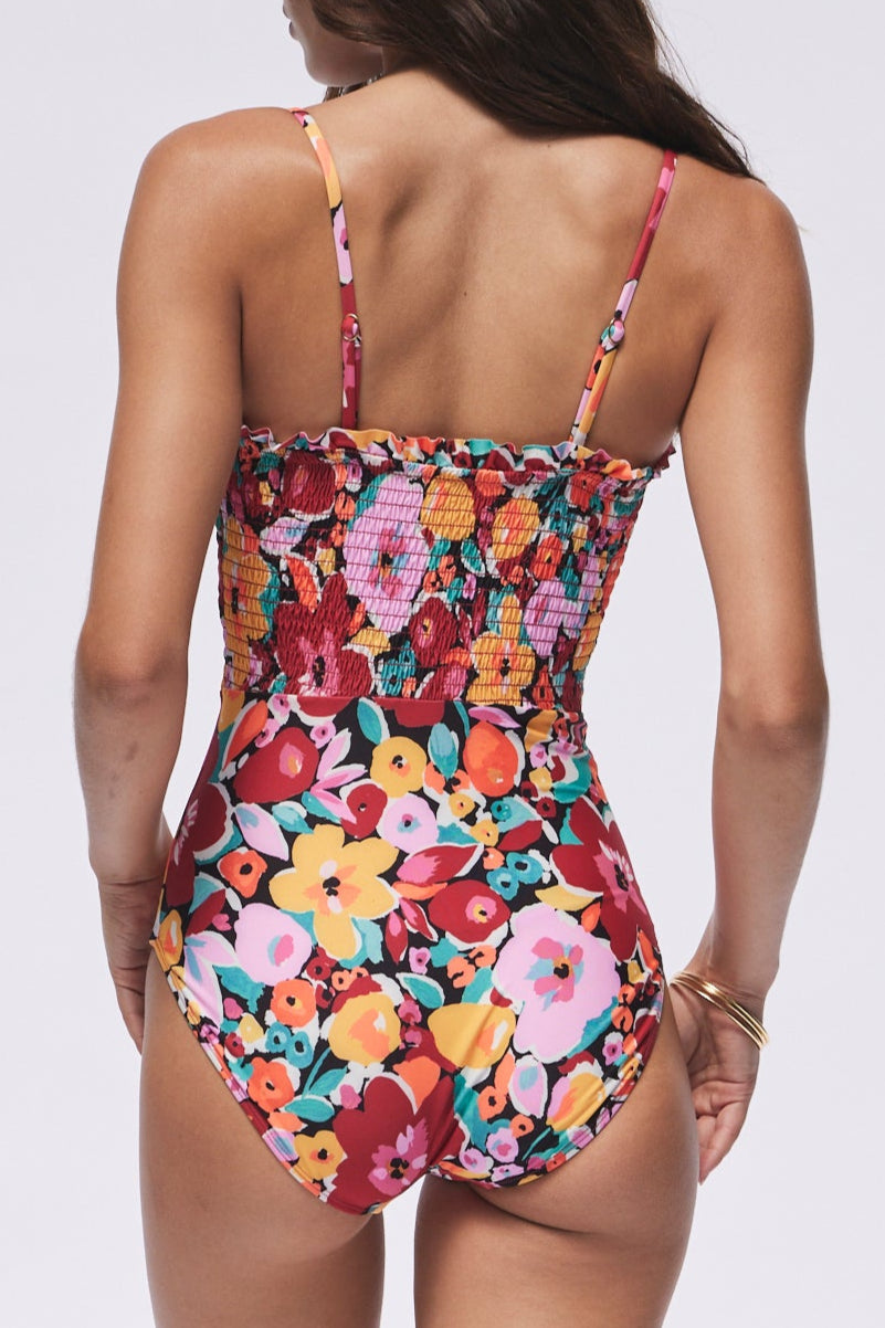 Indulge in the luxurious style of our Carrie Smocked Bandeau One-Piece Swimsuit. Elegantly designed with smocked adjustable straps and a colorful floral print, this swimsuit radiates sophistication and exclusivity. Bask in the compliments as you make a splash in this tasteful and fashionable piece.