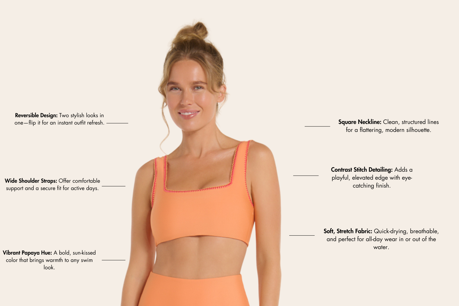This flattering square-neck top features wide straps for comfortable support and a clean, modern silhouette. With its reversible design, you get two looks in one—perfect for mixing, matching, and making the most of your swimwear. Finished in a bold papaya hue with contrast stitch detailing, the Carrie Top is a standout essential that blends playful energy with timeless style.