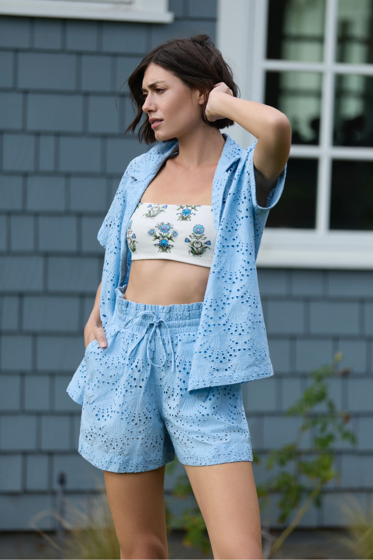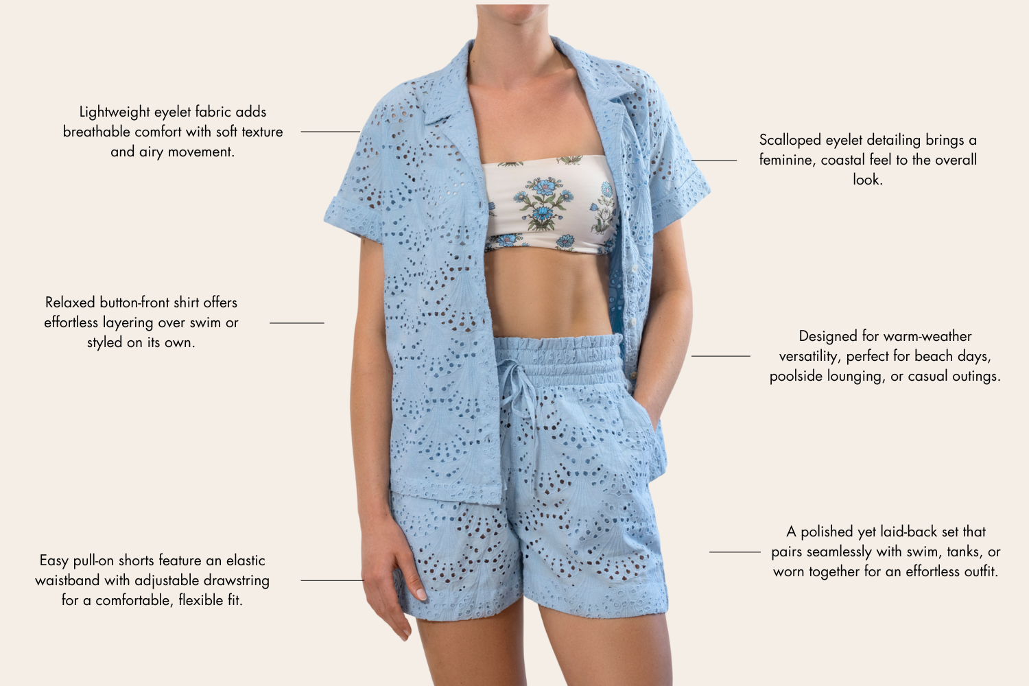 Designed in a lightweight eyelet fabric with an easy pull-on fit, these shorts are made for throwing on after a swim or styling for casual summer days. The relaxed silhouette keeps things comfortable, while the adjustable drawstring waist allows for a customizable fit. Easy, breathable, and endlessly versatile, Jenna is the kind of piece you’ll pack for every getaway.