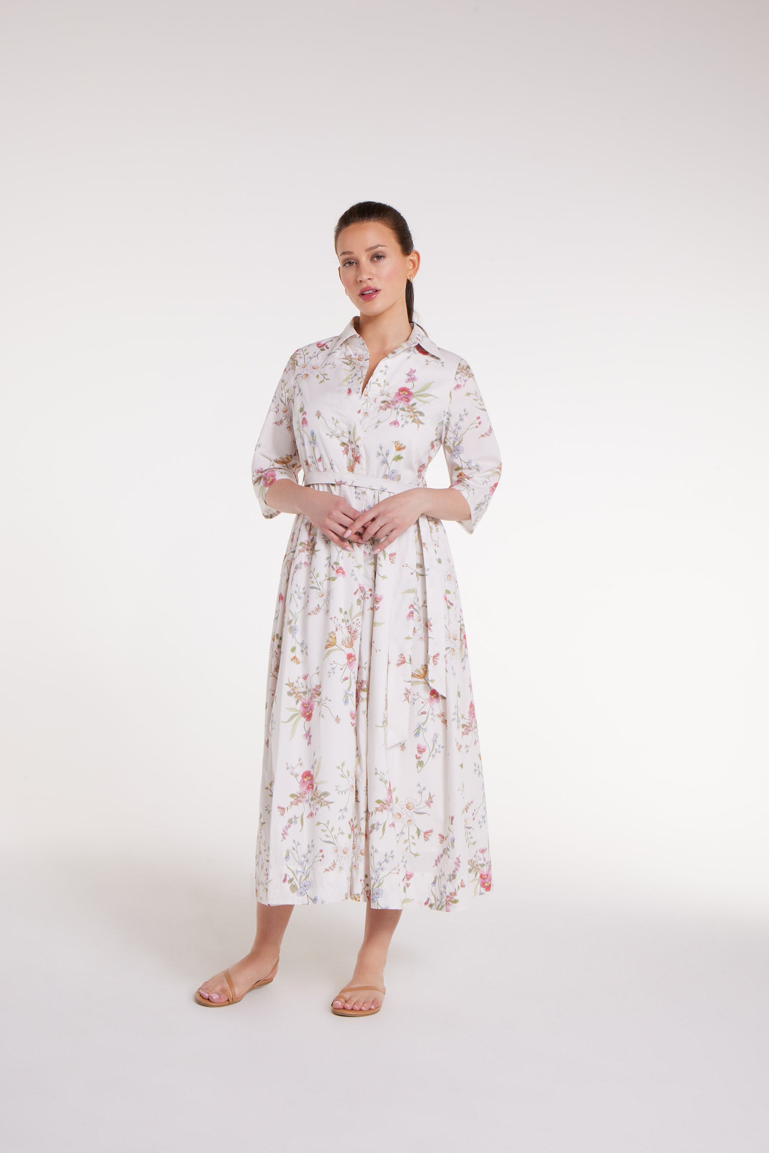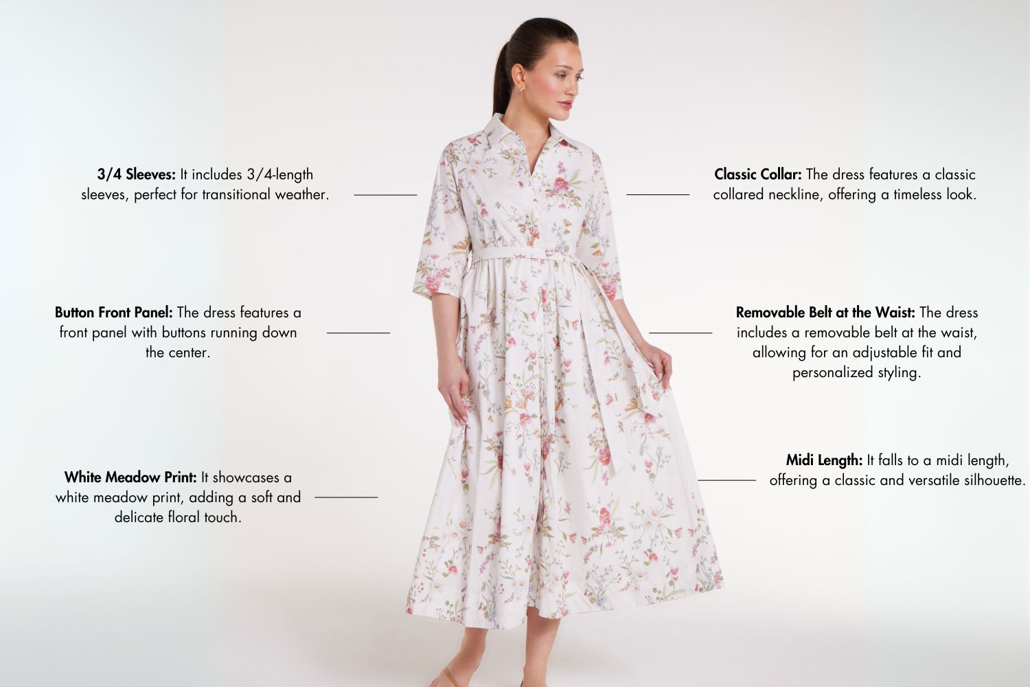 The light, fresh floral print on a crisp white backdrop creates a breezy, modern look with a timeless feel. Featuring 3/4 sleeves, a flattering button-front design, and a removable belt that cinches at the waist, this dress allows you to create a perfectly tailored fit. Designed with a chic collared neck and attention to detail, the White Meadow pattern adds a soft, romantic touch. Perfect for any occasion, the Francesca dress combines style, comfort, and a subtle nod to nature’s beauty.