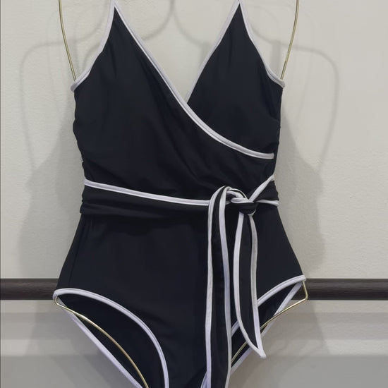 Exude Confidence & Elegance with Our Amelia V-Neck Wrap One-Piece Swimsuit in Classic Black & White
