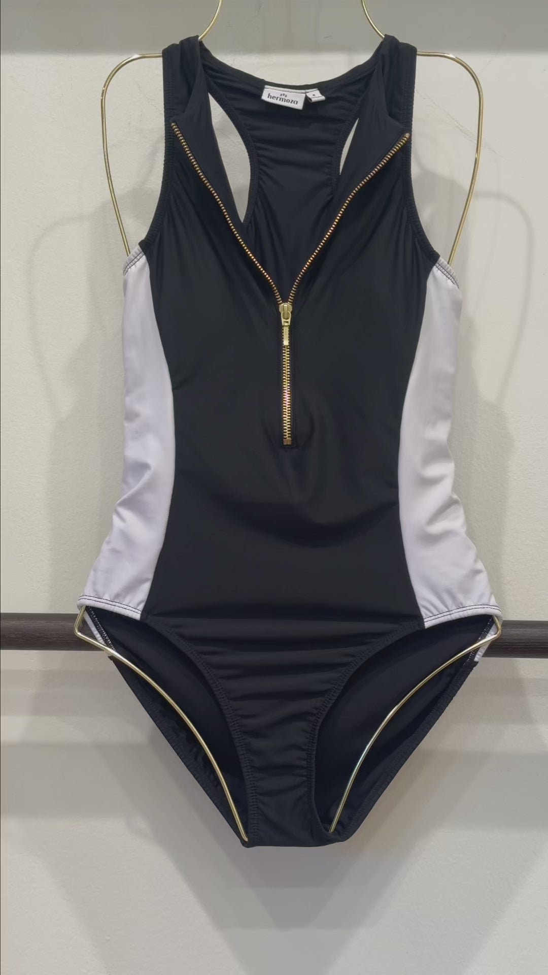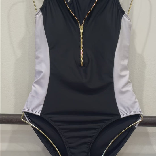 Elevate your swimwear with the Margaret High Neck Zipper One-Piece in classic black and white, blending style and functionality