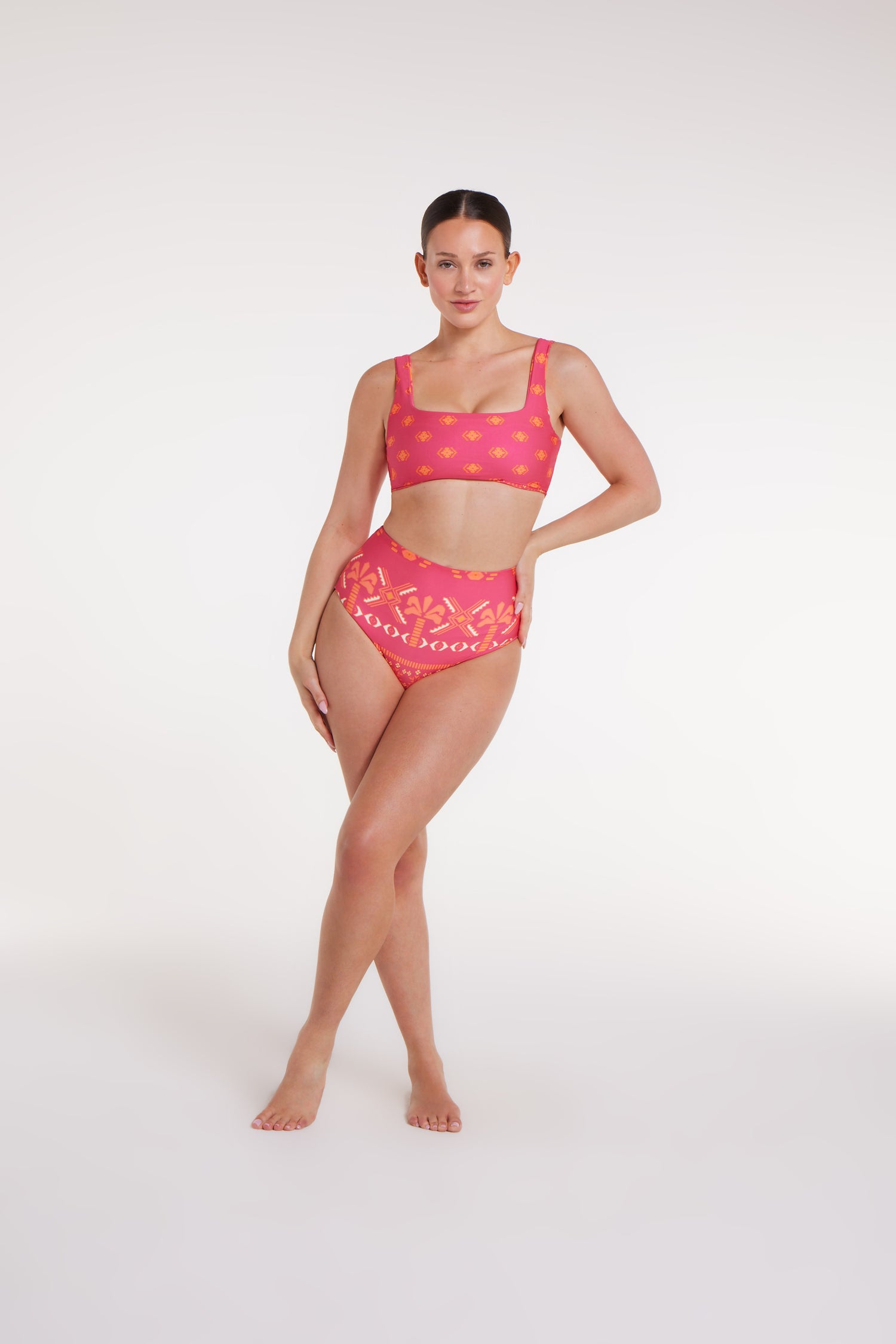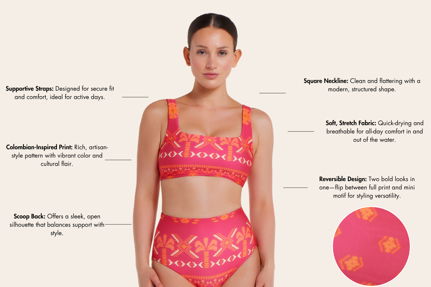 Designed for both versatility and bold expression, this vibrant top features a square neckline and wide, supportive straps for a secure, flattering fit. With its reversible design—bold Colombian-inspired print on one side and a playful mini motif on the other—the Maggie lets you switch up your look with ease. Sporty, stylish, and full of personality, it’s the perfect blend of function and flair.