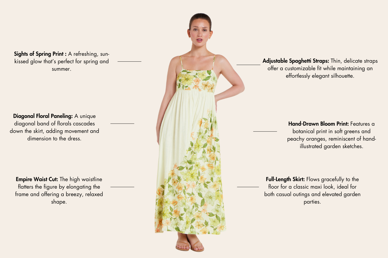 • Full-Length Skirt: Flows gracefully to the floor for a classic maxi look, ideal for both casual outings and elevated garden parties.