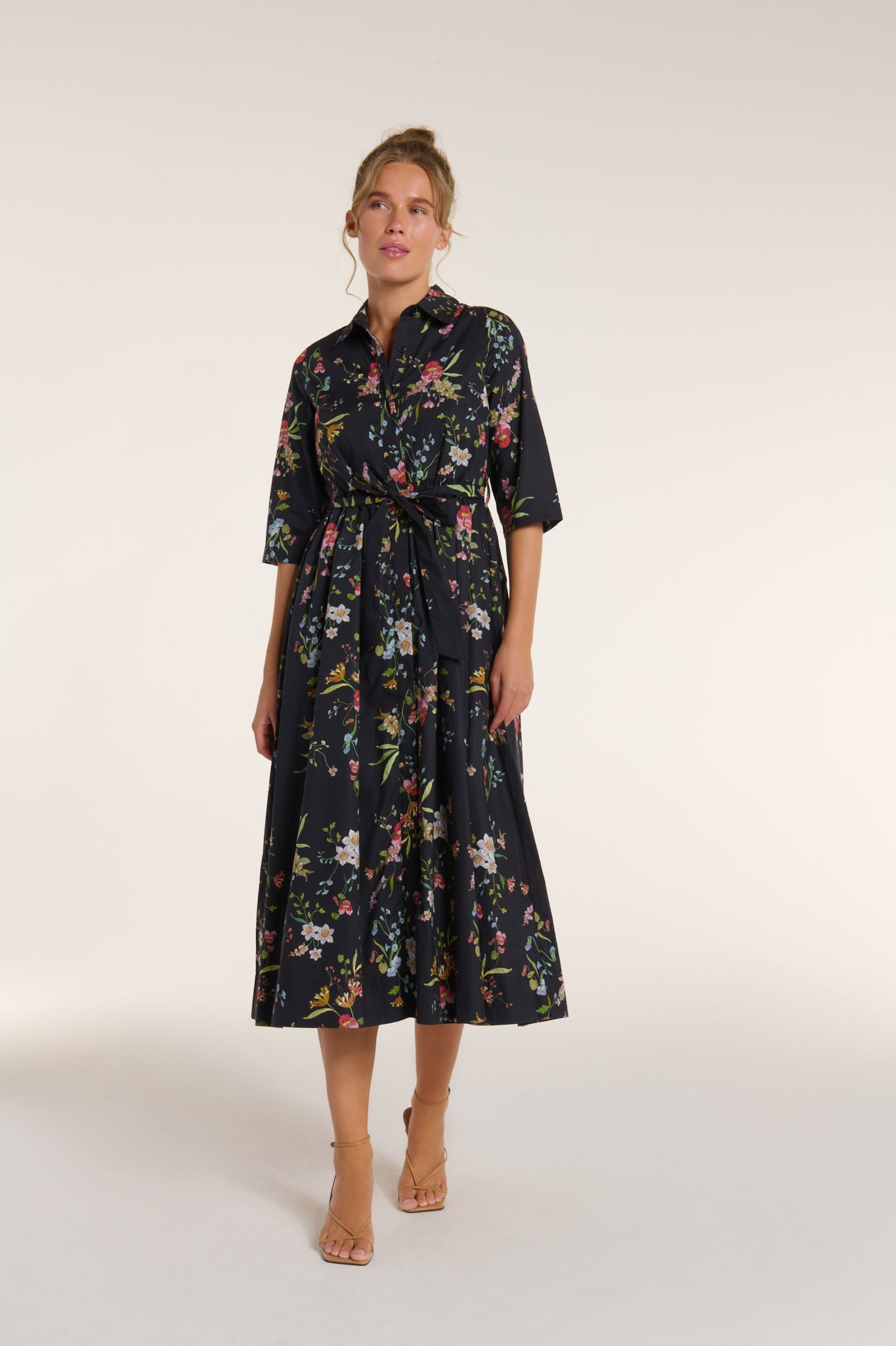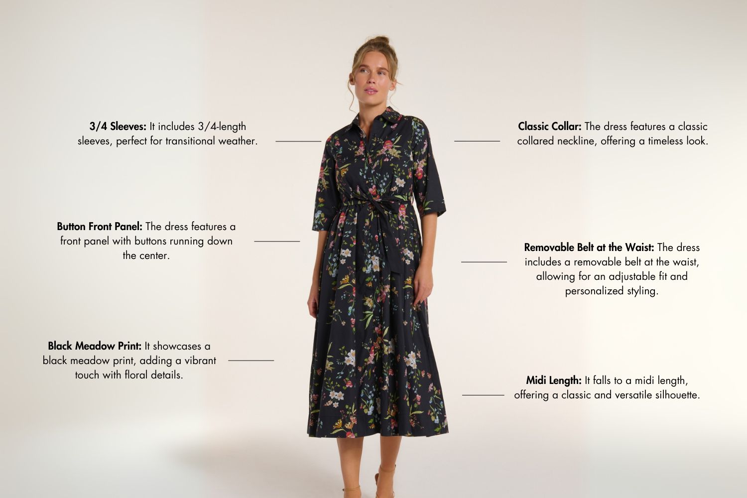 The striking floral print on a deep, dark backdrop is beautifully paired with a chic collared neck, 3/4 sleeves, and a flattering button-front design. This maxi dress features a removable belt that allows you to customize your fit, cinching the waist for a sleek silhouette. Crafted with meticulous attention to detail, the Black Meadow pattern offers a bold yet refined look that will effortlessly elevate your style. Perfect for any occasion, the Francesca dress ensures comfort, elegance, and a touch of nature's beauty.
