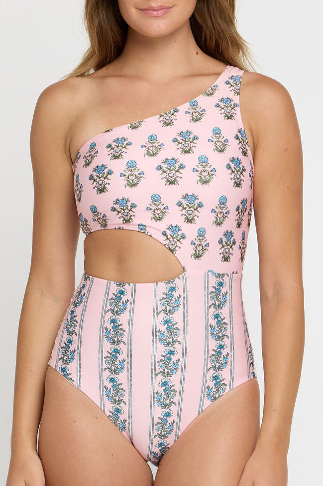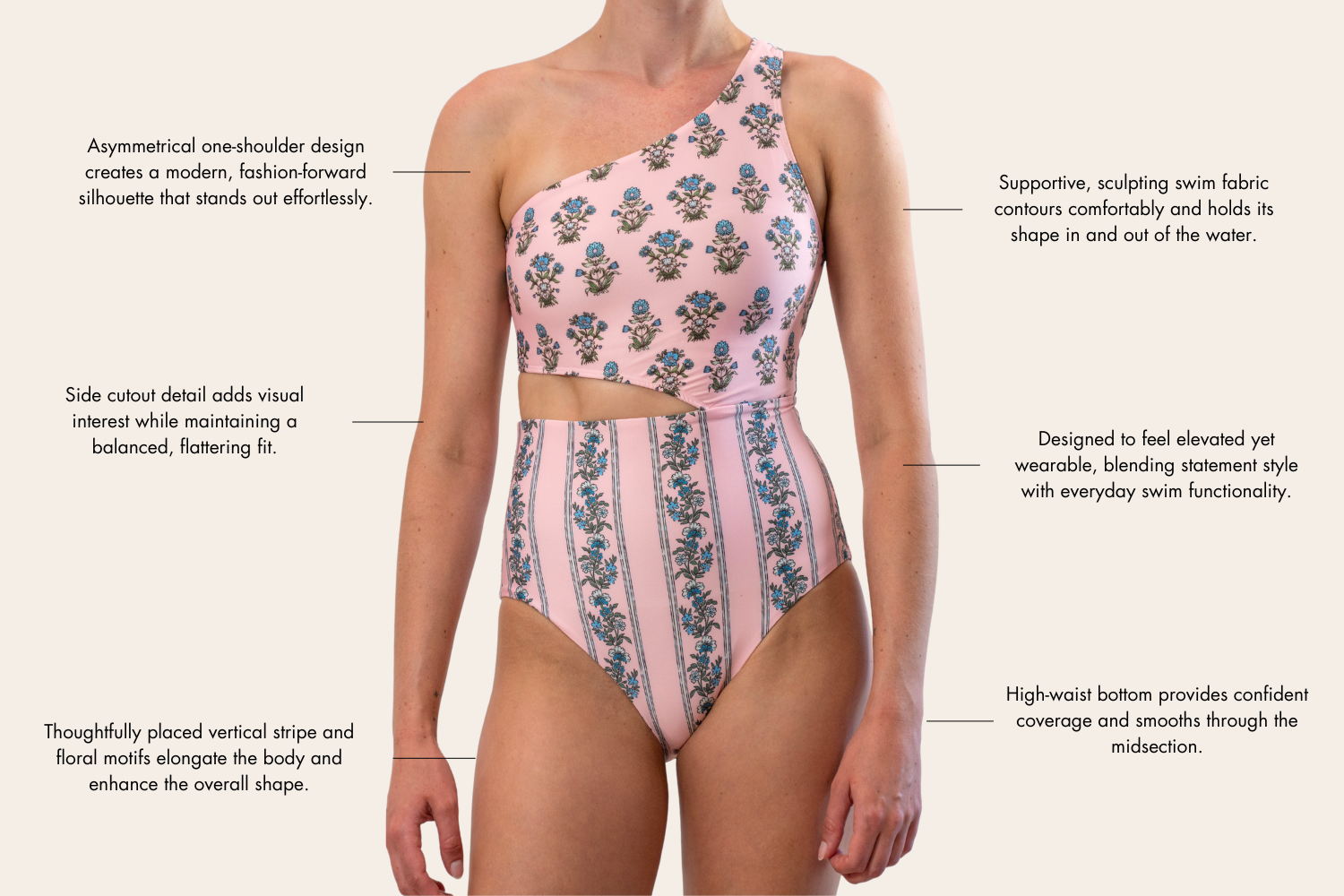 Designed with a modern one-shoulder neckline and a flattering cutout detail, this one-piece balances bold style with confident coverage. The mixed floral prints add visual interest while elongating the body, and the high-rise bottom creates a smooth, sculpted silhouette. Equal parts playful and polished, Gemma is made for poolside moments that call for something a little extra.