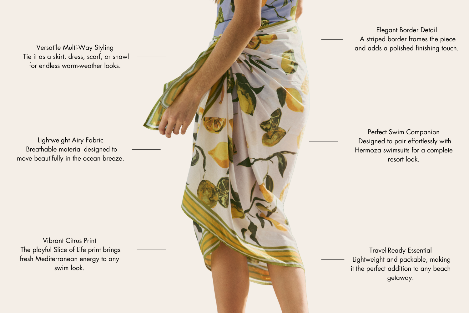 Designed to wrap effortlessly around the waist, this piece drapes beautifully and moves with ease. The generous length offers elegant coverage, while the lightweight fabric keeps it breezy and unfussy—perfect for poolside lounging, coastal walks, or styling multiple ways on vacation.
