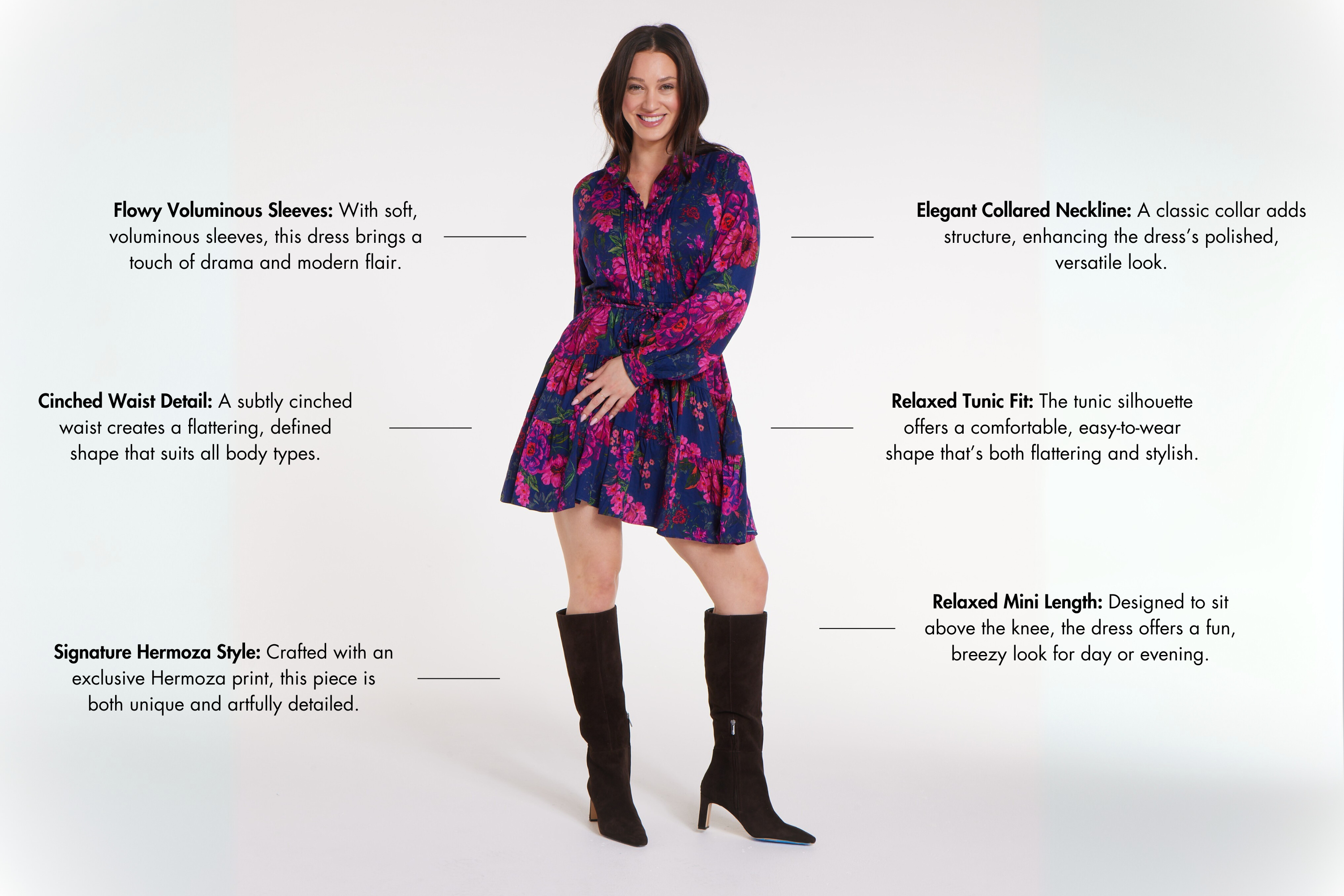 The Louisa Mini Tunic Dress showcases vibrant floral hues, offering a timeless modern look.