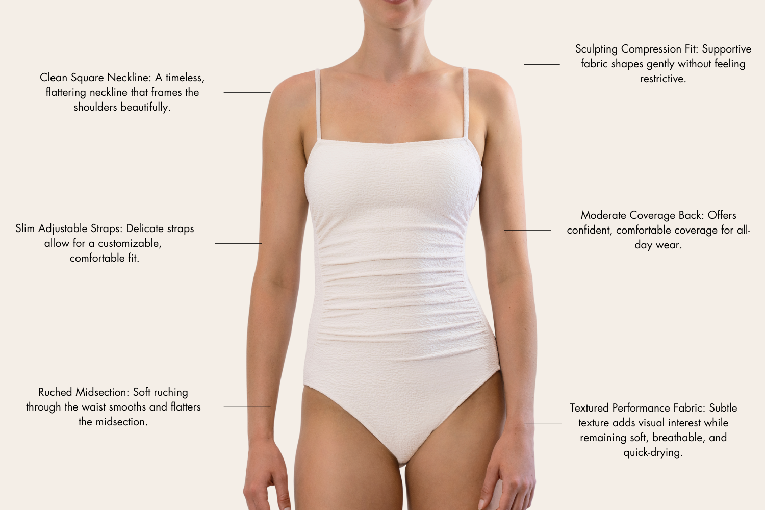 Behind the Suit: The Lupe was designed to be effortlessly flattering, comfortable, and timeless. Its clean square neckline and slim straps create a classic silhouette, while the ruched midsection provides gentle shaping where you want it most. Crafted in textured, supportive fabric, the Lupe offers a refined look that feels easy to wear—perfect for poolside lounging, beach days, and warm-weather getaways.