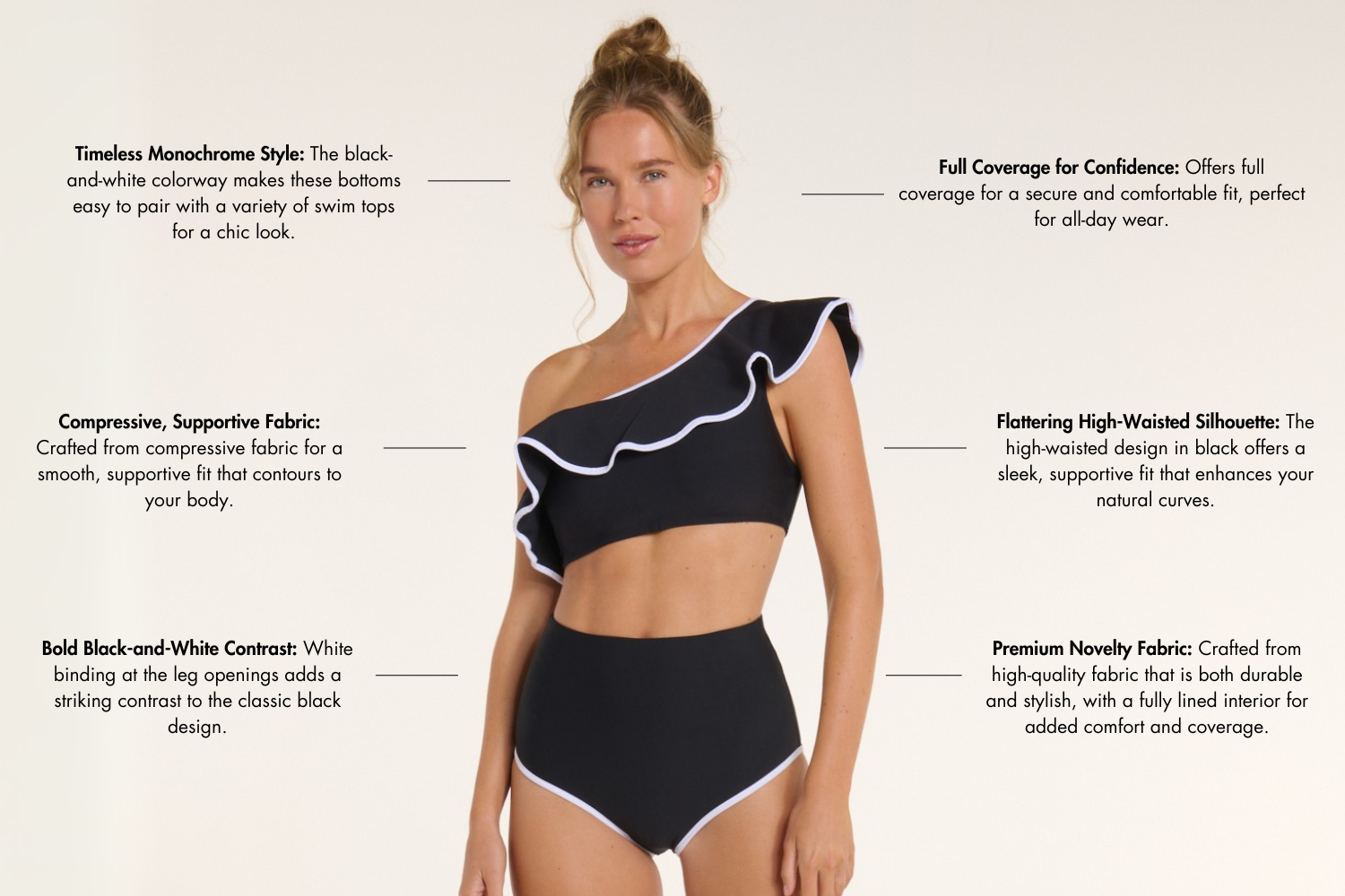 Elevate your swim style with our Mackenzie Sculpted High-Waisted Bottoms, featuring a sleek black-and-white colorblock design