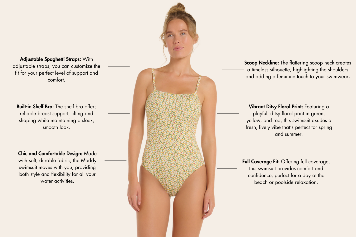 The Maddy One-Piece Suit combines vibrant style with ultimate comfort. Featuring a flattering scoop neckline and adjustable straps, this suit provides a customized, secure fit. The ditsy floral print adds a fun, feminine touch, while the full coverage ensures confidence all day long. Perfect for sunbathing or swimming, the Maddy Suit is a chic addition to your spring swimwear collection.