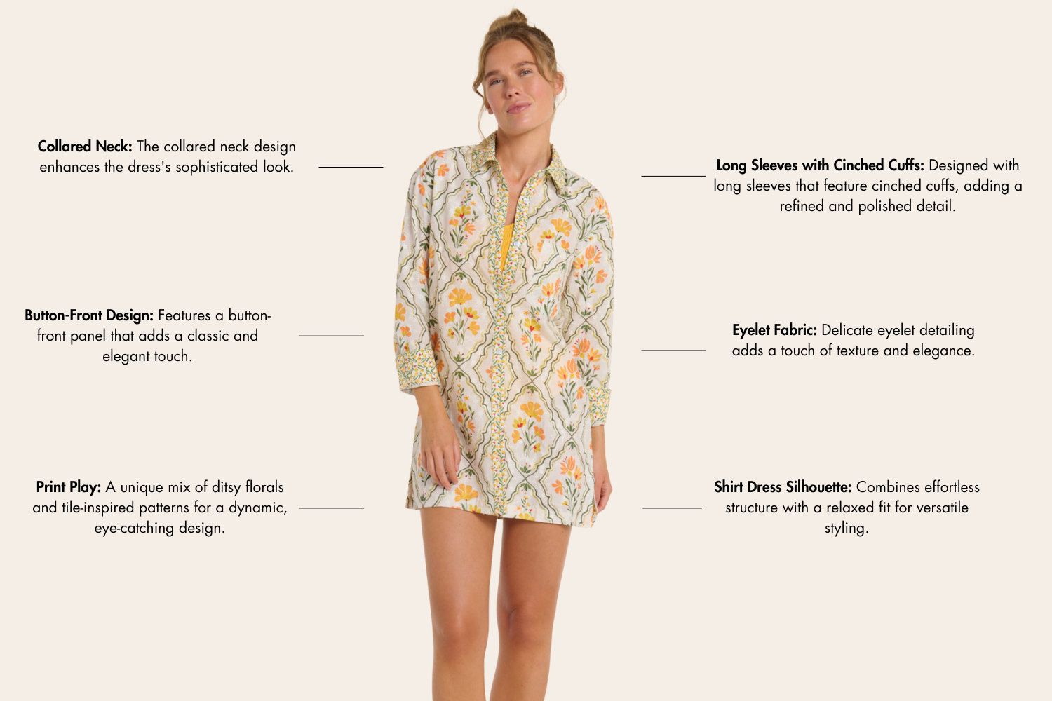 Timeless, breezy, and effortlessly chic—the Marie Shirt Dress is the perfect blend of structure and ease. Designed in a stunning mix of floral tile and ditsy prints, this dress embraces print play while remaining endlessly versatile. The delicate eyelet fabric adds texture and breathability, making it a must-have for warm-weather layering. Featuring a classic collared neckline and button-front design, the Marie transitions seamlessly from a relaxed cover-up to a polished daytime look.