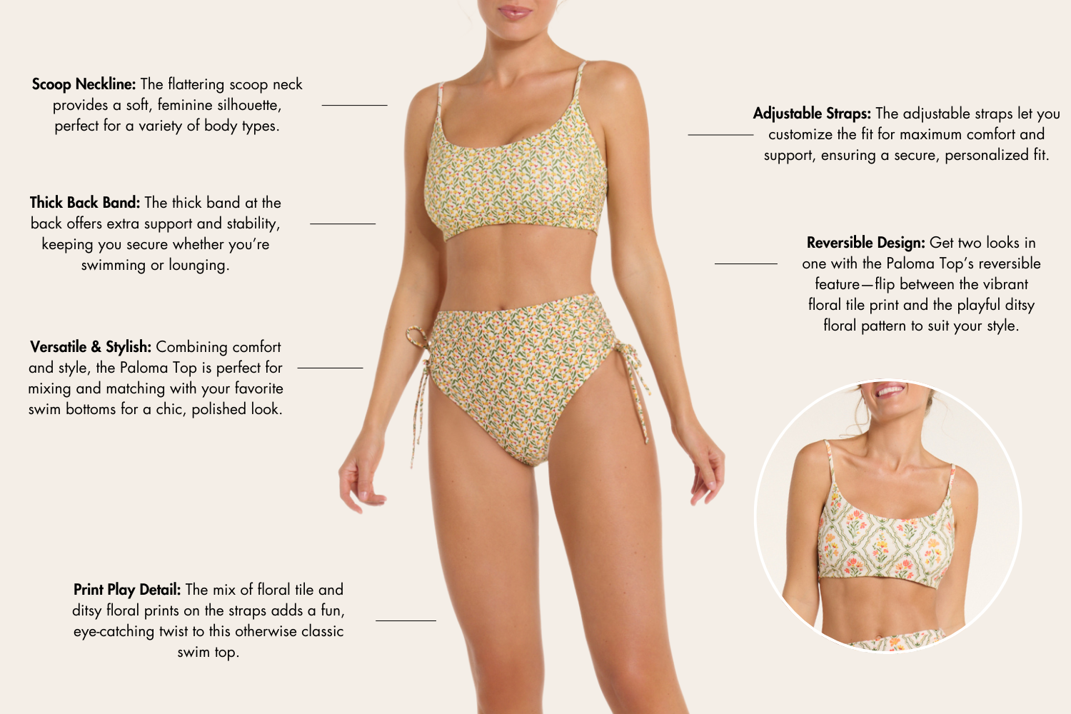 The Paloma Reversible Swim Top offers two looks in one, with a vibrant floral tile print on one side and a playful ditsy floral pattern on the other. The adjustable straps and thick back band provide a secure, customized fit, while the flattering scoop neckline adds a feminine touch. Perfect for mixing and matching, this stylish swim top is a must-have for your spring swimwear collection.