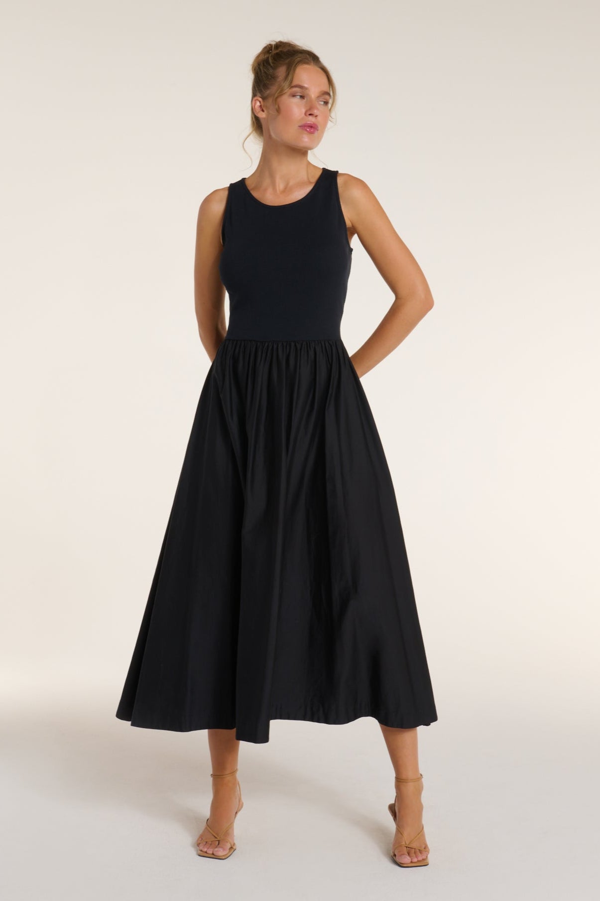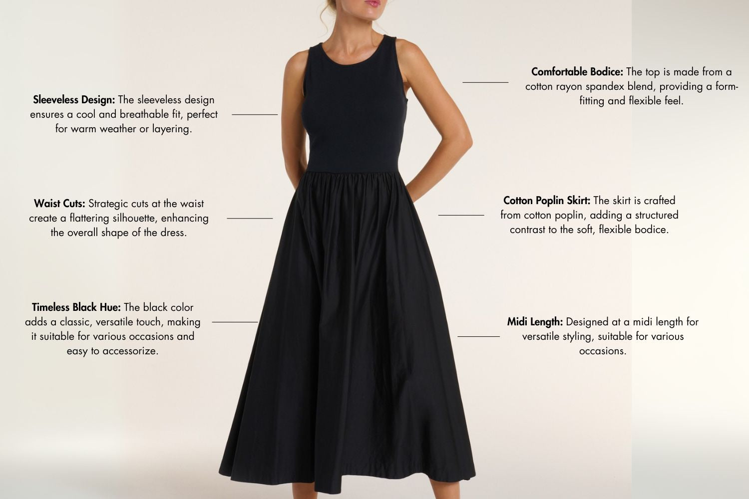 The bodice, made from a cotton rayon spandex blend, offers a form-fitting and flexible feel that moves with you. The skirt, crafted from cotton poplin, adds structure and balance to the dress, creating a beautiful contrast to the soft bodice. With a flattering midi length, this dress elongates the silhouette for an elegant finish. The sleeveless design ensures breathability, making it ideal for warm weather or layering with a jacket or cardigan. Strategic waist cuts enhance the dress’s shape, offering a flattering and feminine look. The timeless black hue makes it versatile and perfect for any occasion, whether you're dressing up for a formal event or keeping it casual with the right accessories.