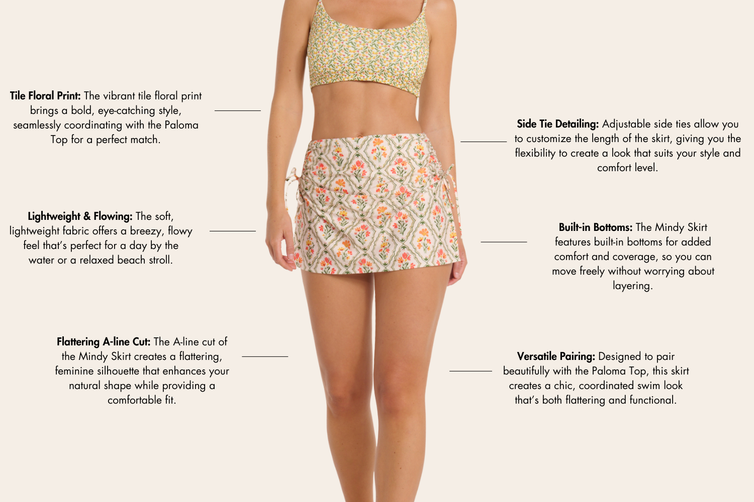 • Beach and Poolside Days: With adjustable ties for a customizable fit, the Mindy Skirt transitions seamlessly from a laid-back cover-up to a more tailored look.